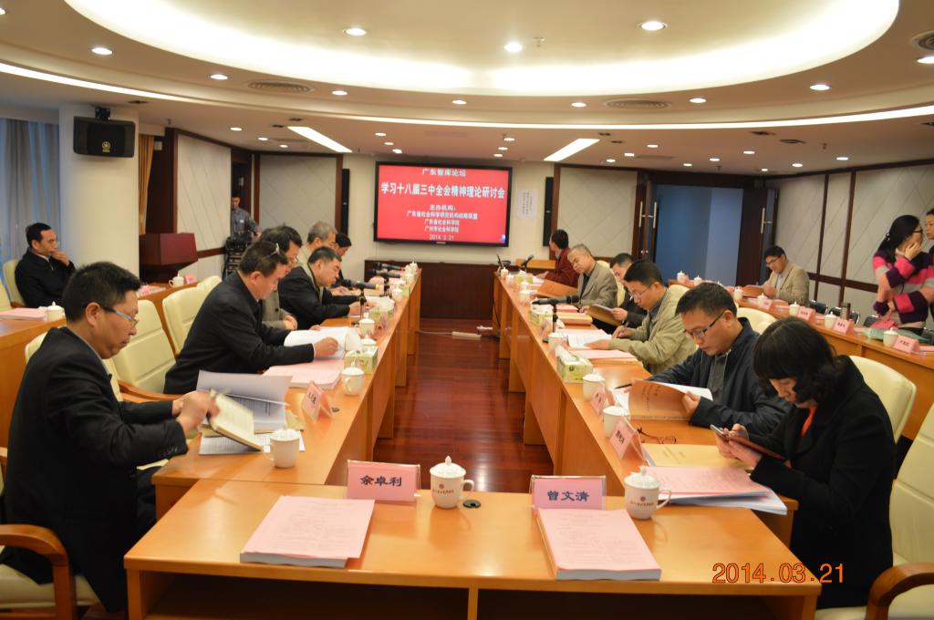 2014年3月21日,“广东智库论坛——学习十八届三中全会精神理论研讨会”在广州市社会科学院九楼会议室召开。论坛由广东智库联盟理事会、广东省社会科学院、广州市社会科学院主办。广东智库联盟成员单位、省社科院各分院、省内各高等院校、广东科学发展观基地、广东地方特色文化基地等单位专家学者出席。广东外语外贸大学副校长顾也力教授、广东外语外贸大学区域一体化法治研究中心常务副主任朱最新教授应邀出席,并就“法治视野下负面清单管理模式研究及广东的路径选择”做了主题发言,获得与会者的好评。