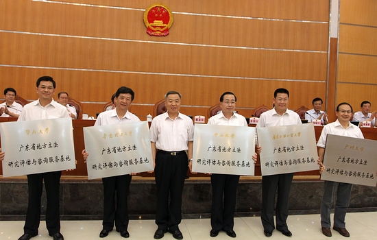 为了进一步发挥高校在立法中的作用,推进科学立法、民主立法、开门立法,提高立法质量,广东省人大常委会与广东外语外贸大学及中山大学、华南理工大学、暨南大学、广州大学等五所高校合作建立广东省地方立法研究评估与咨询服务基地。基地全方位参与广东省地方立法工作,为地方立法工作提供智力支持和专业咨询服务。2013年5月29日下午,广东省第十二届人大常委会第二次会议举行了向广东省地方立法研究评估与咨询服务基地授匾仪式。我校校长仲伟合、副校长石佑启、区域一体化法治研究中心常务副主任朱最新参加了授牌仪式,广东省人大常委会黄龙云主任向仲伟合校长授予“广东省地方立法研究评估与咨询服务基地”的牌匾。