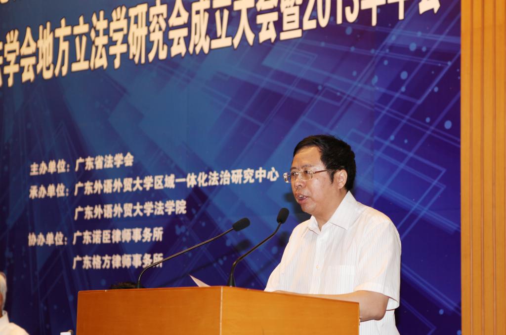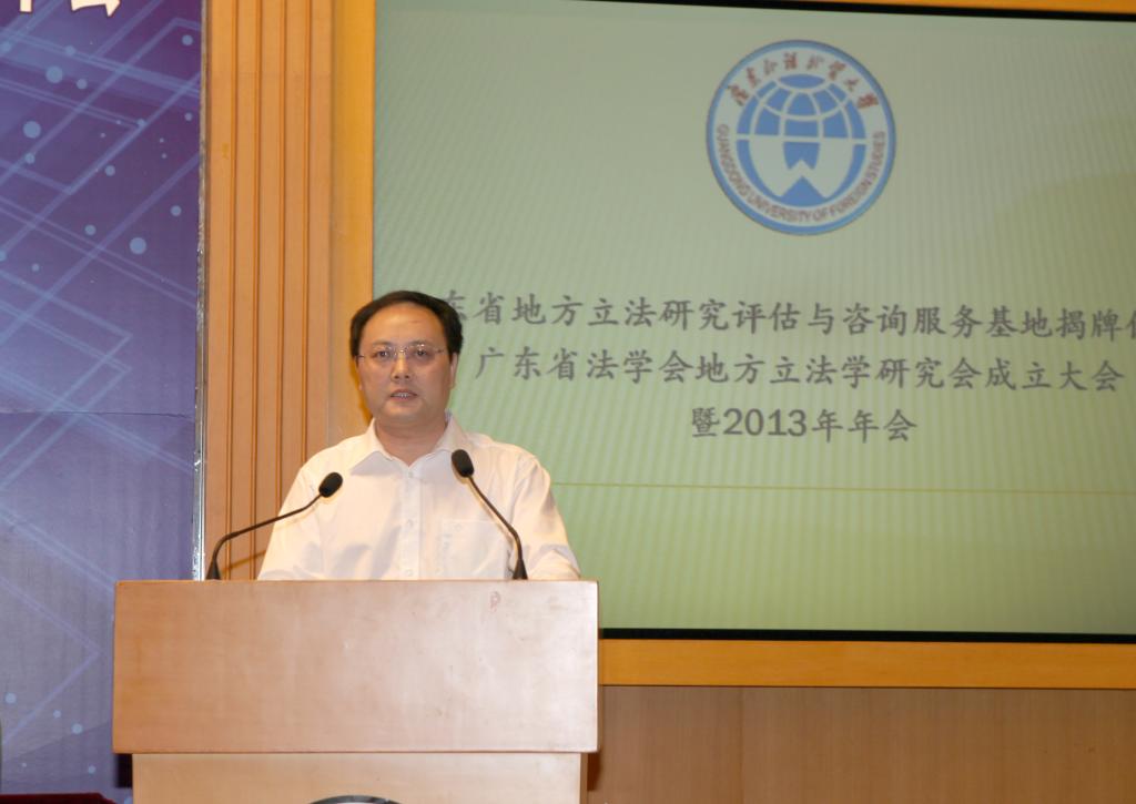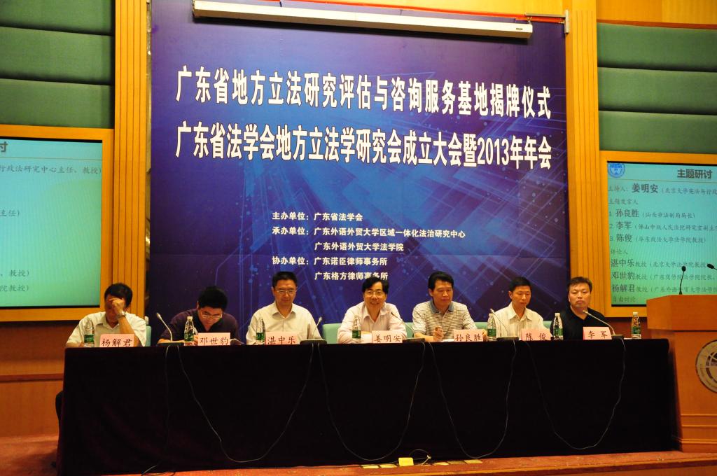 2013年6月29日,“广东省地方立法研究评估与咨询服务基地”揭牌仪式、广东省地方立法学研究会成立大会暨2013年学术年会在广东外语外贸大学成功举行。全国政协原副主席、中国人权研究会会长罗豪才,广东省人大常委会法制工作委员会主任王波,广东省法学会常务副会长兼秘书长陈瑞光、广东外语外贸大学副校长顾也力、广东外语外贸大学副校长石佑启等出席。