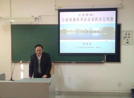 2013年12月12日上午,我校副校长石佑启教授在南校区E405主讲题为“行政体制改革法制化的有关问题”的公法前沿讲座。