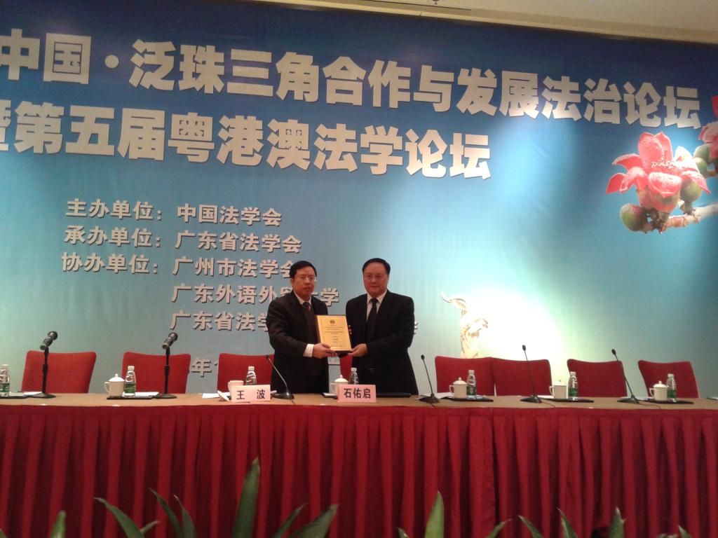 2013年12月21日,由中国法学会主办,广东省法学会承办,广州市法学会、广东外语外贸大学区域一体化法治研究中心、广东外语外贸大学法学院、广东省法学会律师学研究会协办的第八届中国·泛珠三角合作与发展法治论坛暨第五届粤港澳法学论坛在广州举行。来自粤、桂、湘、闽、赣、琼、川、滇、黔、渝10省(市、区)以及香港、澳门特别行政区的150多名代表出席了此次论坛。开幕式由中国法学会常务理事、广东省政协副主席梁伟发主持。中国法学会党组书记、常务副会长陈冀平,广东省委副书记、政法委书记、社工委主任马兴瑞,广东省法学会会长王骏出席论坛开幕式并致辞。广东外语外贸大学党委书记隋广军出席了本次论坛并受邀作为颁奖嘉宾为优秀论文获奖者代表颁发了荣誉证书。