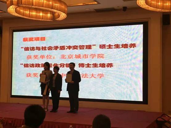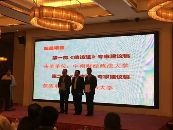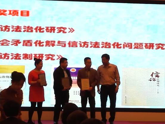 根据研讨会议程安排,对在2016年度全国信访制度理论研究与实践创新中做出突出贡献的单位或个人,颁发荣誉证书给予奖励。我中心石佑启教授和夏金莱博士的合著《社会矛盾化解与信访法治化问题研究》,是我国信访法治化建设提出后第二部专门研究信访法治化建设的著作。鉴于此,中国法学会行政法学研究会、北京市信访矛盾分析研究中心联合对该著作颁发特别贡献奖励证书,中心朱最新教授上台代表领取奖励证书。另外,石佑启教授和陈小君教授分别作为代表为受奖者颁发荣誉奖励证书。