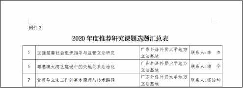 2020年6月24日,省人大制度研究会发布研究课题确认通知,中心杨治坤教授申报《党领导立法工作的基本原理与技术路径》、李杰博士申报《加强慈善社会组织指导与监管立法研究》、谢宇博士申报《粤港澳大湾区建设中的央地关系法治化》分别获得立项资格。
