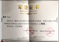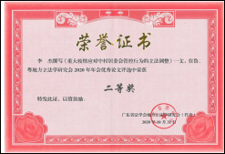 谢宇博士《中央推进粤港澳大湾区建设的法治路径——“中央权力行使指南”的提出》《最高人民法院在合宪性审查中的现状、困境与出路》分别获鲁粤地方立法学研究会2020年年会优秀论文一等奖、闽粤宪法学研究会2020年学术年会优秀论文二等奖,杨治坤教授《区域协调发展的制度障碍及其破解路径》、李杰博士《重大疫情应对中村居委会管控行为的立法调整》获二等奖。