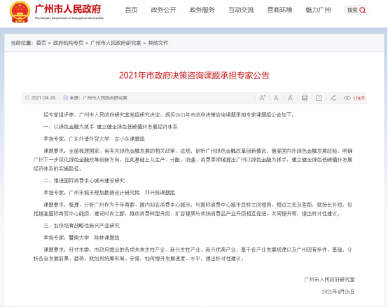 日前,广州市人民政府研究室发布2021年市政府决策咨询课题承担专家公告。经课题组申报、专家评审、市政府研究室党组研究决定,此次共有3项课题立项,中心古小东教授课题组申报的《以绿色金融为抓手 建立健全绿色低碳循环发展经济体系》成功中标。