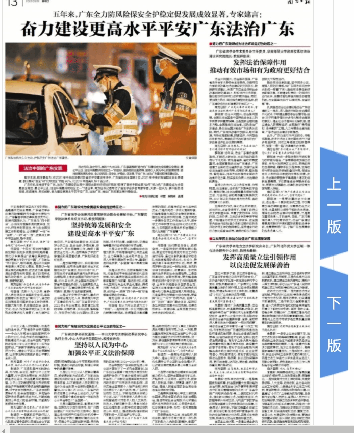 2022年5月22日,《南方日报》A13专版刊登“五年来,广东全力防风险保安全护稳定促发展成效显著,专家建言:奋力建设更高水平平安广东法治广东”。其中,专栏“以科学民主依法立法促进广东高质量发展”刊载了中心主任朱最新教授提出的“发挥高质量立法引领作用 以良法促发展保善治”专家建言。