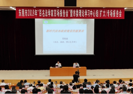 7月22日,东莞市2019年“百名法学家百场报告会”暨市委理论学习中心组(扩大)专场报告会举行,邀请广东外语外贸大学校长、教授、博士生导师石佑启以“新时代法治政府建设的新要求”为主题作专题报告。市政协主席骆招群等市几套班子领导参加报告会,市委常委、政法委书记杨东来主持报告会。