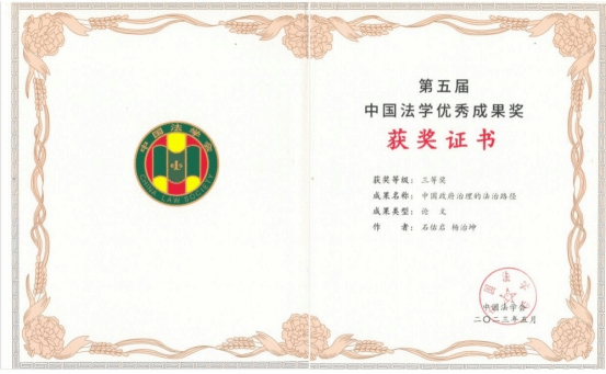 2023年5月19日,第五届中国法学优秀成果奖表彰会在北京举行。我中心石佑启、杨治坤教授的合作论文《中国政府治理的法治路径》荣获三等奖,杨治坤教授参加了此次表彰会。