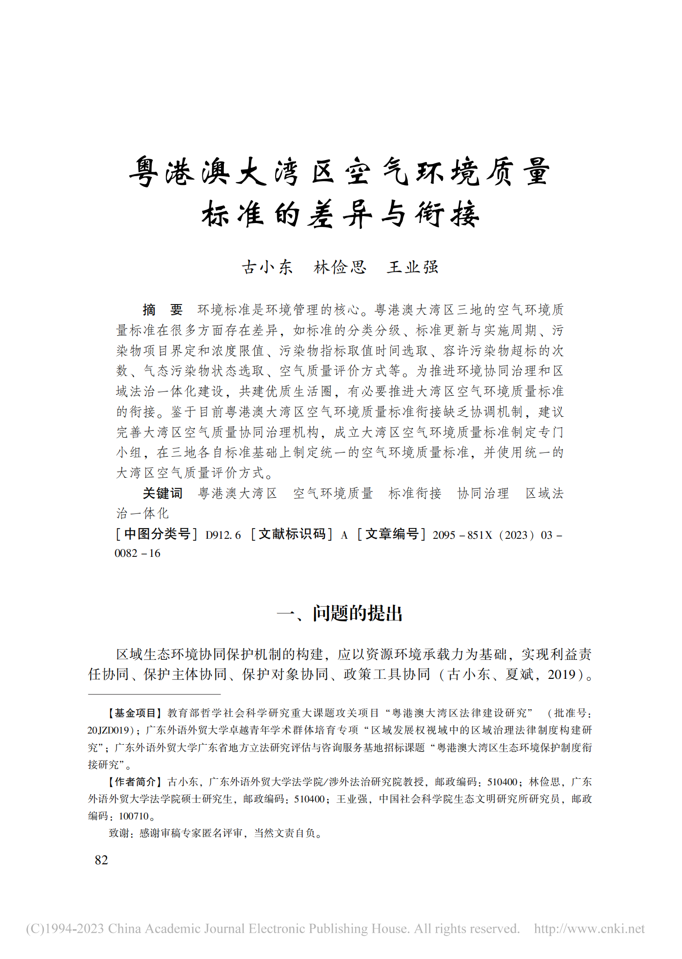 关键词:粤港澳大湾区;空气环境质量;标准衔接;协同治理;区域法治一体化
