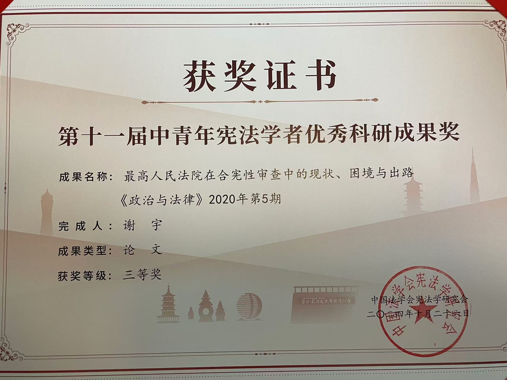 经评审委员集体评议和无记名投票,共评选确定拟获奖著作8部,拟获奖论文18篇。我院谢宇副教授论文《最高人民法院在合宪性审查中的现状、困境与出路》荣获第十一届中青年宪法学者优秀科研成果论文类三等奖。
