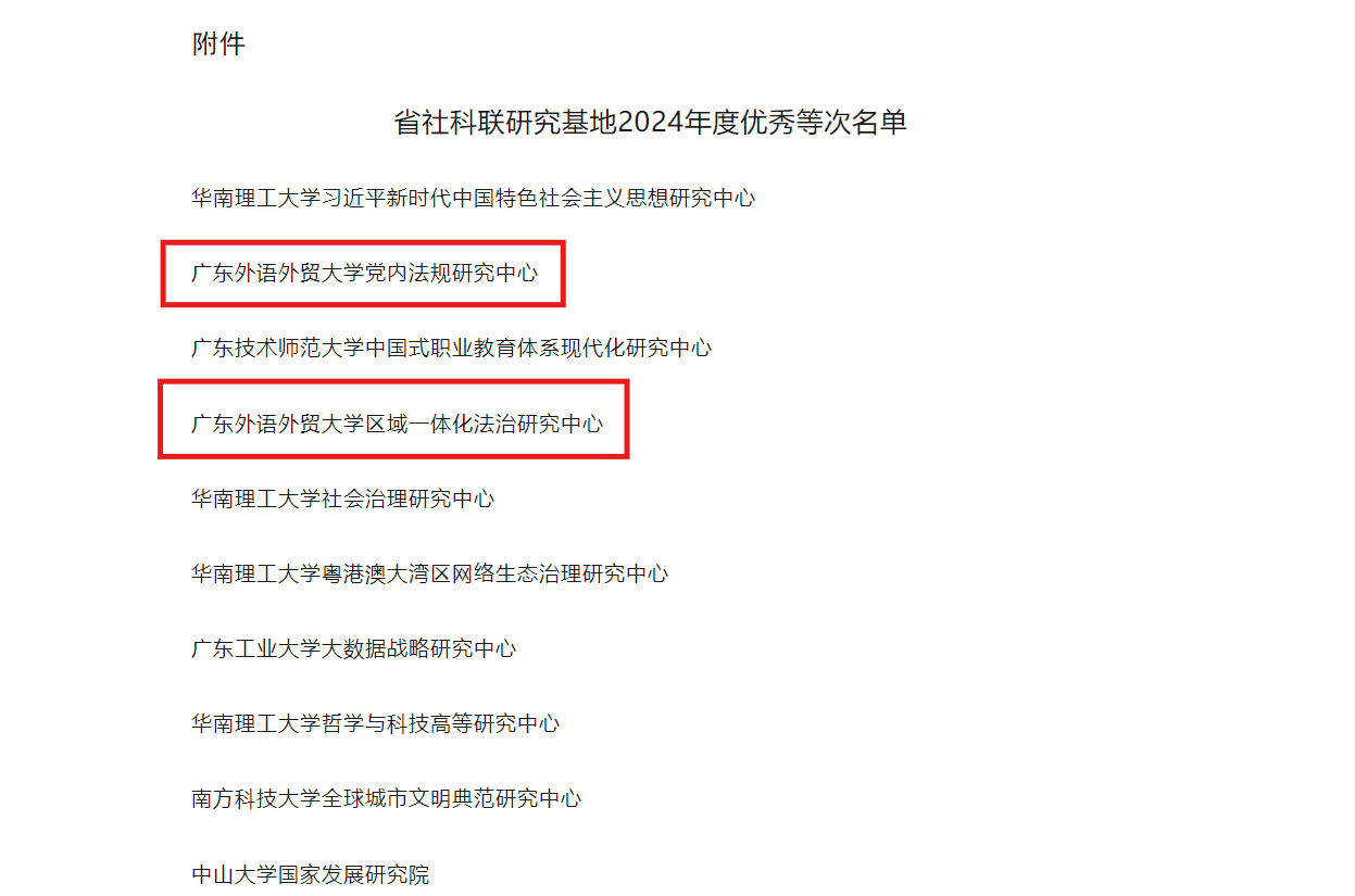 2025年5月28日,省社科联研究基地公布了2024年度评估结果,广东外语外贸大学区域一体化法治研究中心、党内法规研究中心获评优秀,这是两个中心自2019年参加省社科联考核以来,连续第5年获得考评优秀。