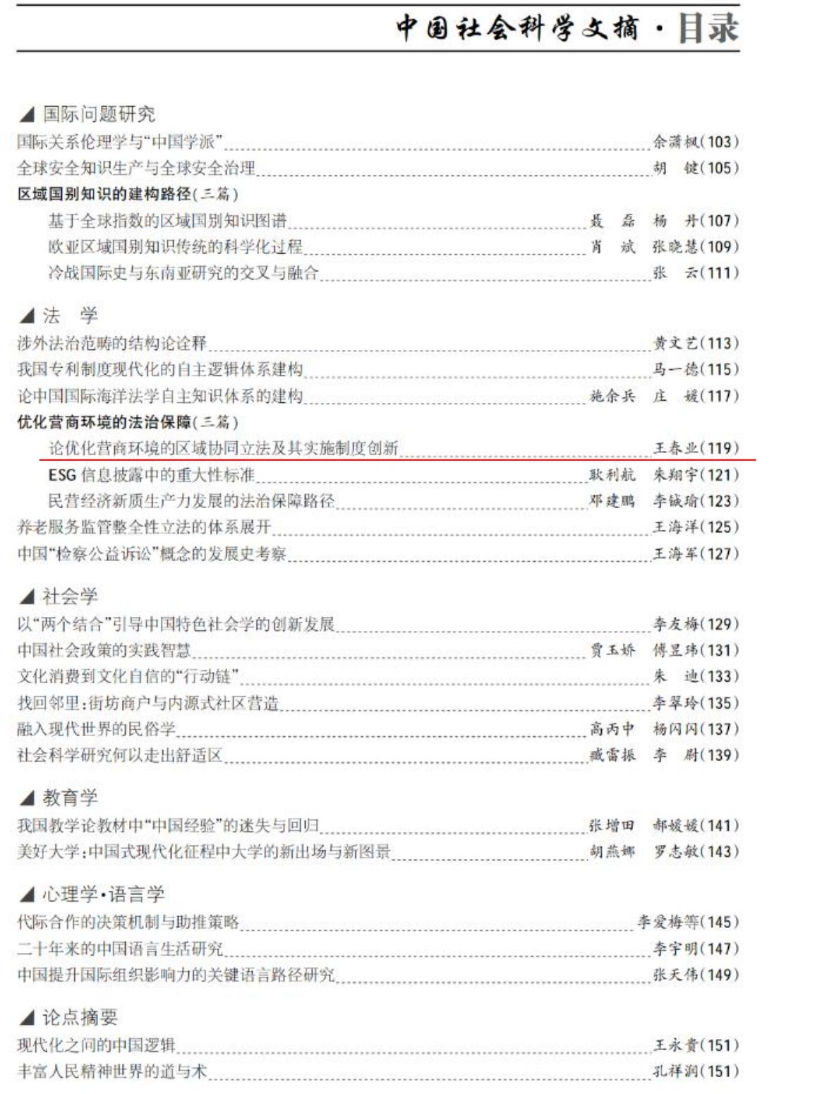王春业教授在《政治与法律》2024年第12期发表的论文《论优化营商环境的区域协同立法及其实施制度创新》被《中国社会科学文摘》 2025年第4期全文转载。