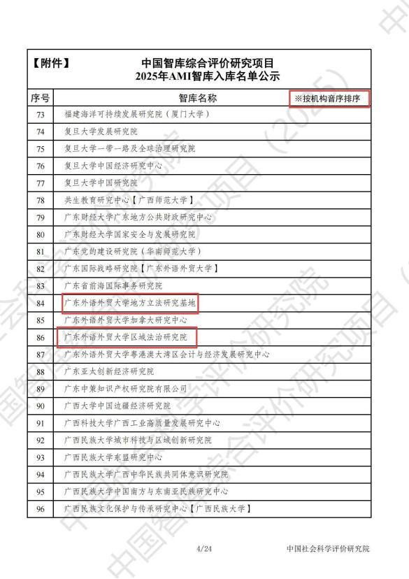 近日,中国社会科学评价研究院公布《中国智库综合评价研究项目(2025)AMI智库入库名单》,广东外语外贸大学区域法治研究院、地方立法研究基地成功入选。据统计,广东外语外贸大学共有五家研究机构入选2025年AMI智库。