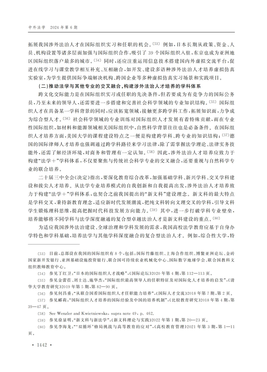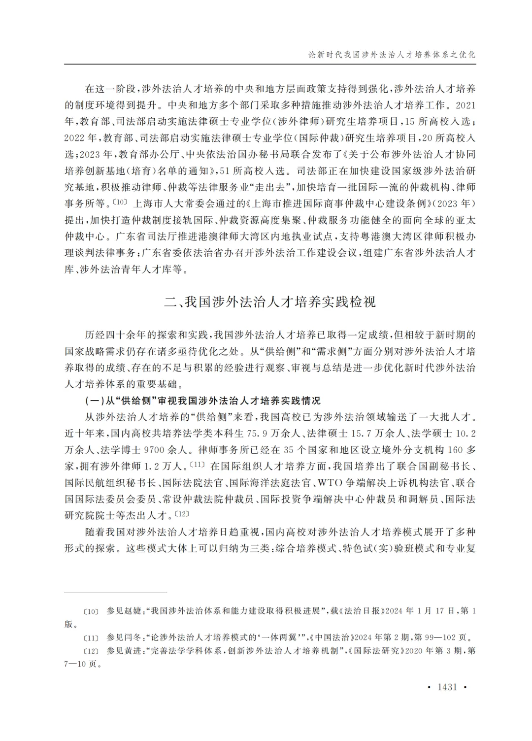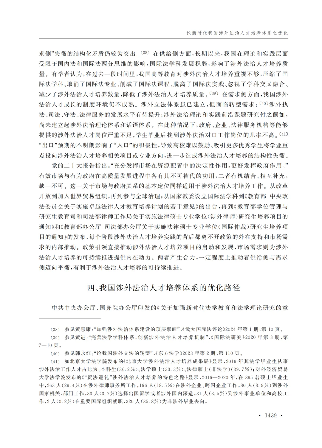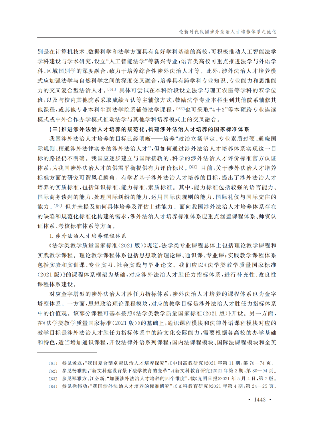 涉外法治人才是我国涉外法治建设之基。通过回顾改革开放以来我国涉外法治人才培养的历程,从“供给侧”和“需求侧”两个维度,对我国涉外法治人才培养的实践情况和中国籍法治人才在国际组织任职情况进行观察,有助于全方位揭示当前我国涉外法治人才培养存在的不足。涉外法治人才培养亟待明确综合素质培育导向,推进“法学+”学科体系建设,推动规范化标准化运行以及依托需求和供给的动态平衡,由此来推进涉外法治人才培养体系优化。应以跨文化交际能力为核心,构建涉外法治人才培养的胜任力体系;推动法学与其他专业的交叉融合,构建涉外法治人才培养的学科体系;推进涉外法治人才培养的规范化,构建涉外法治人才培养的国家标准体系;拓展涉外法治人才的市场需求,构建涉外法治人才培养的供需对接体系,为优化涉外法治人才培养体系提供有效路径。