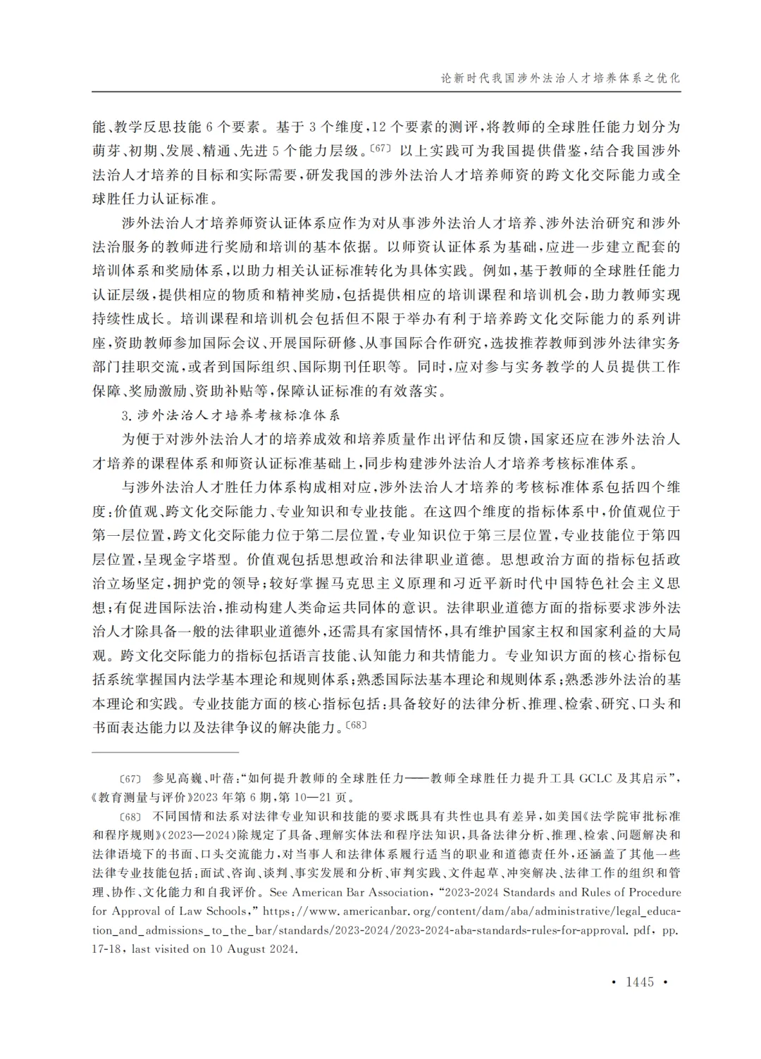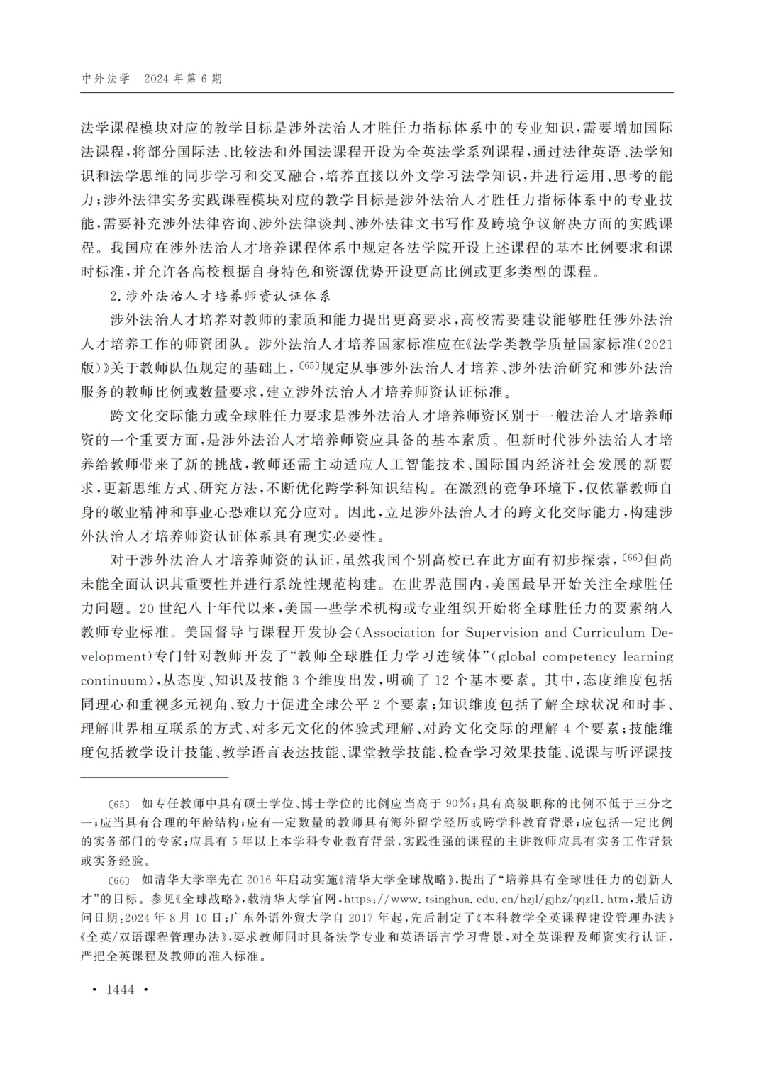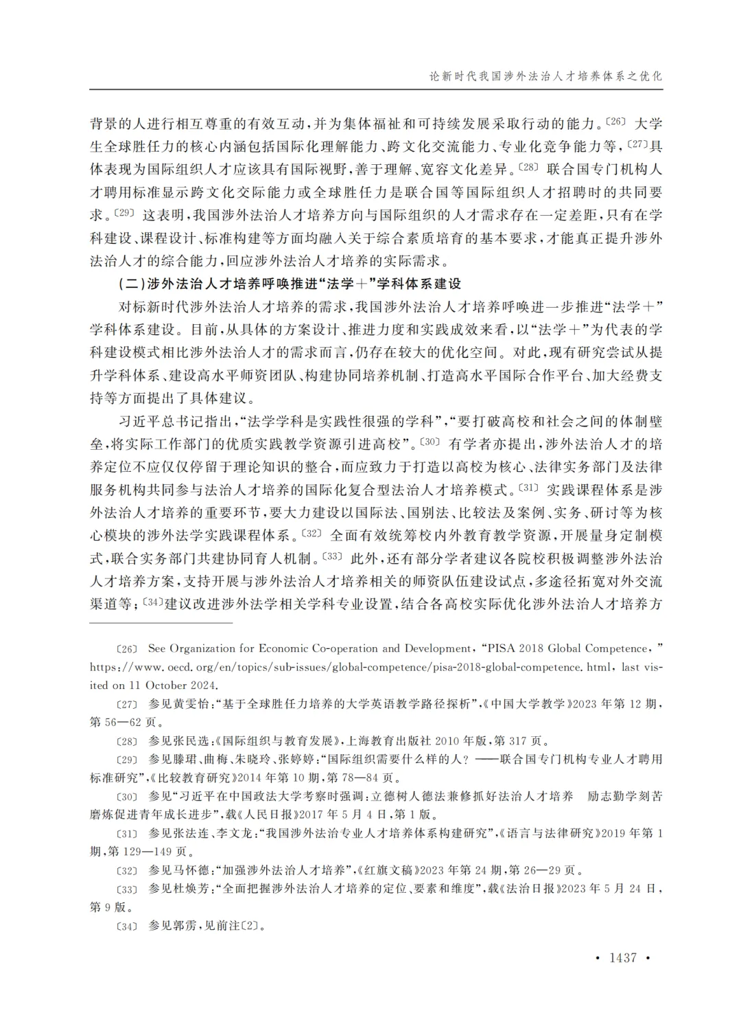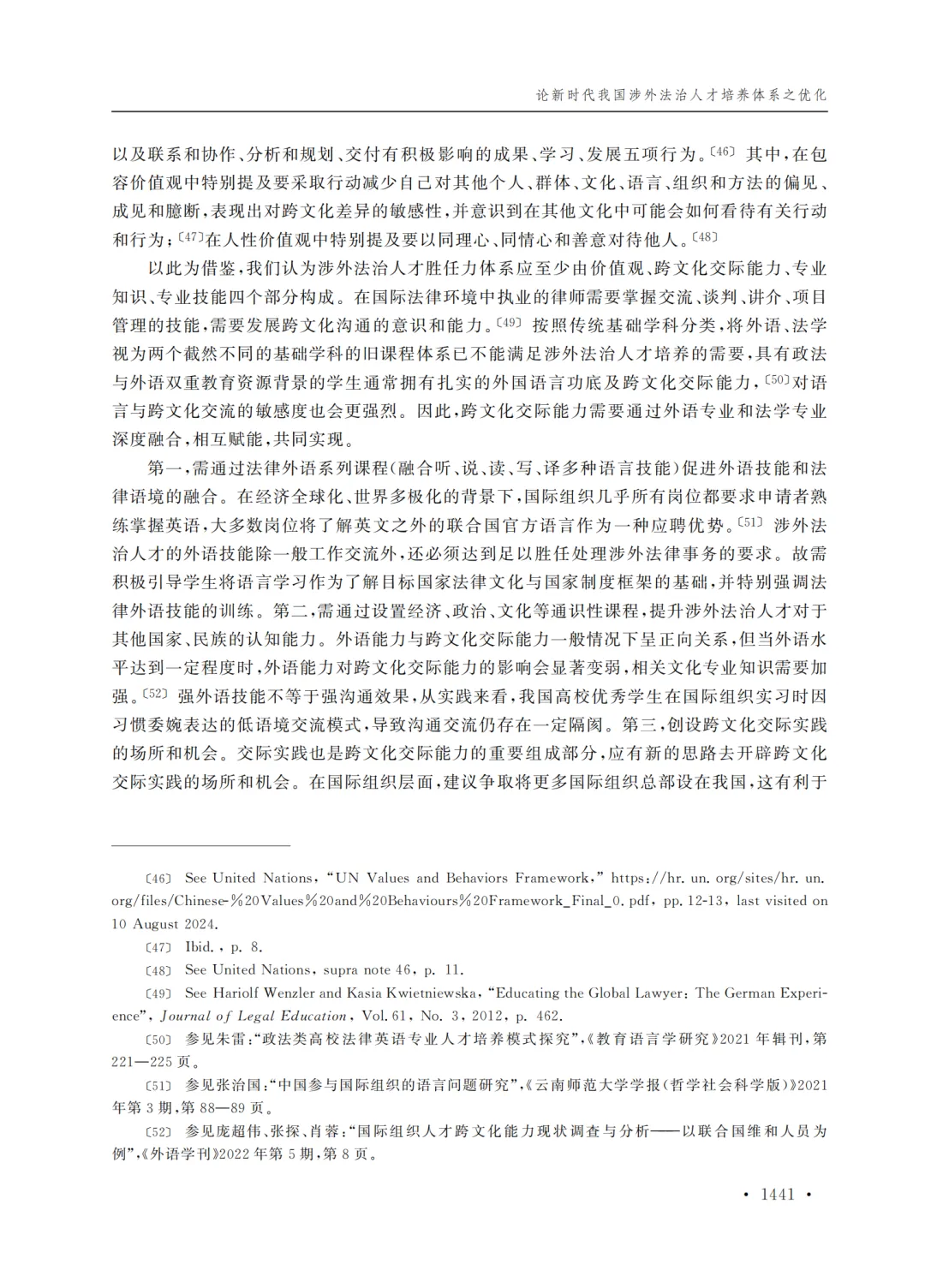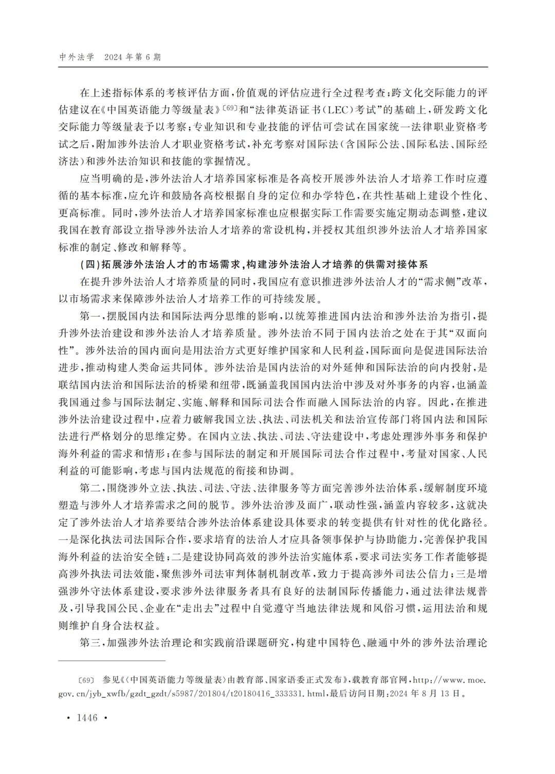 涉外法治人才是我国涉外法治建设之基。通过回顾改革开放以来我国涉外法治人才培养的历程,从“供给侧”和“需求侧”两个维度,对我国涉外法治人才培养的实践情况和中国籍法治人才在国际组织任职情况进行观察,有助于全方位揭示当前我国涉外法治人才培养存在的不足。涉外法治人才培养亟待明确综合素质培育导向,推进“法学+”学科体系建设,推动规范化标准化运行以及依托需求和供给的动态平衡,由此来推进涉外法治人才培养体系优化。应以跨文化交际能力为核心,构建涉外法治人才培养的胜任力体系;推动法学与其他专业的交叉融合,构建涉外法治人才培养的学科体系;推进涉外法治人才培养的规范化,构建涉外法治人才培养的国家标准体系;拓展涉外法治人才的市场需求,构建涉外法治人才培养的供需对接体系,为优化涉外法治人才培养体系提供有效路径。