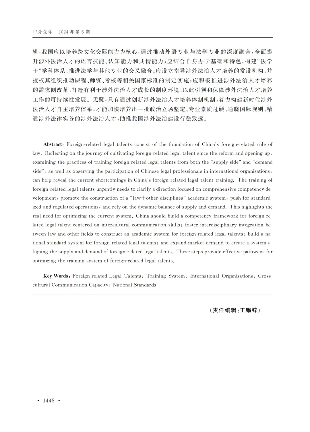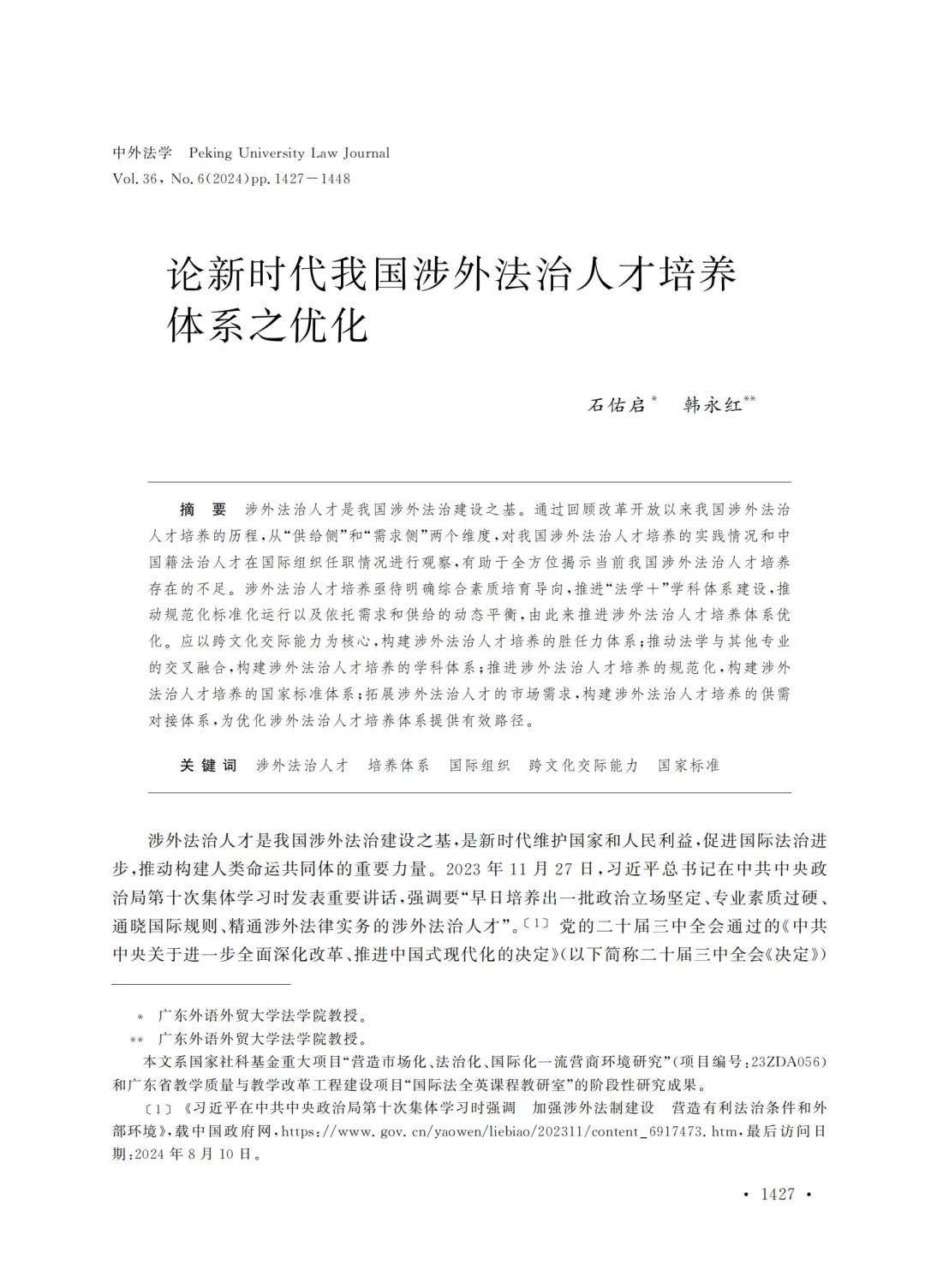 《中国高等学校学术文摘·法学(英文)》(Frontiers of Law in China-Selected Publications from Chinese Universities)2025年第2期全文转载我院石佑启教授、韩永红教授《论新时代涉外法治人才培养体系之优化》一文。该文原载于《中外法学》2024年第6期。