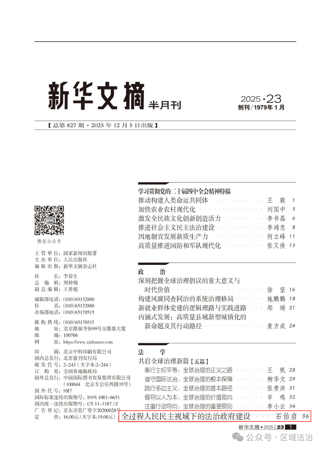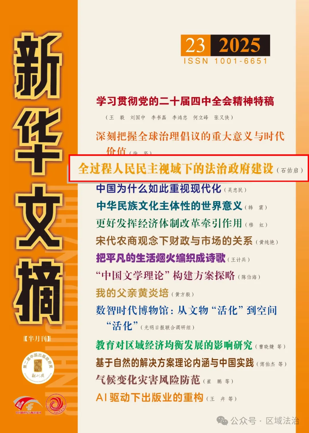 石佑启教授在《现代法学》2025年第4期发表的论文《全过程人民民主视域下的法治政府建设》被《新华文摘》2025年第23期全文转载并列入封面文章。特此祝贺!